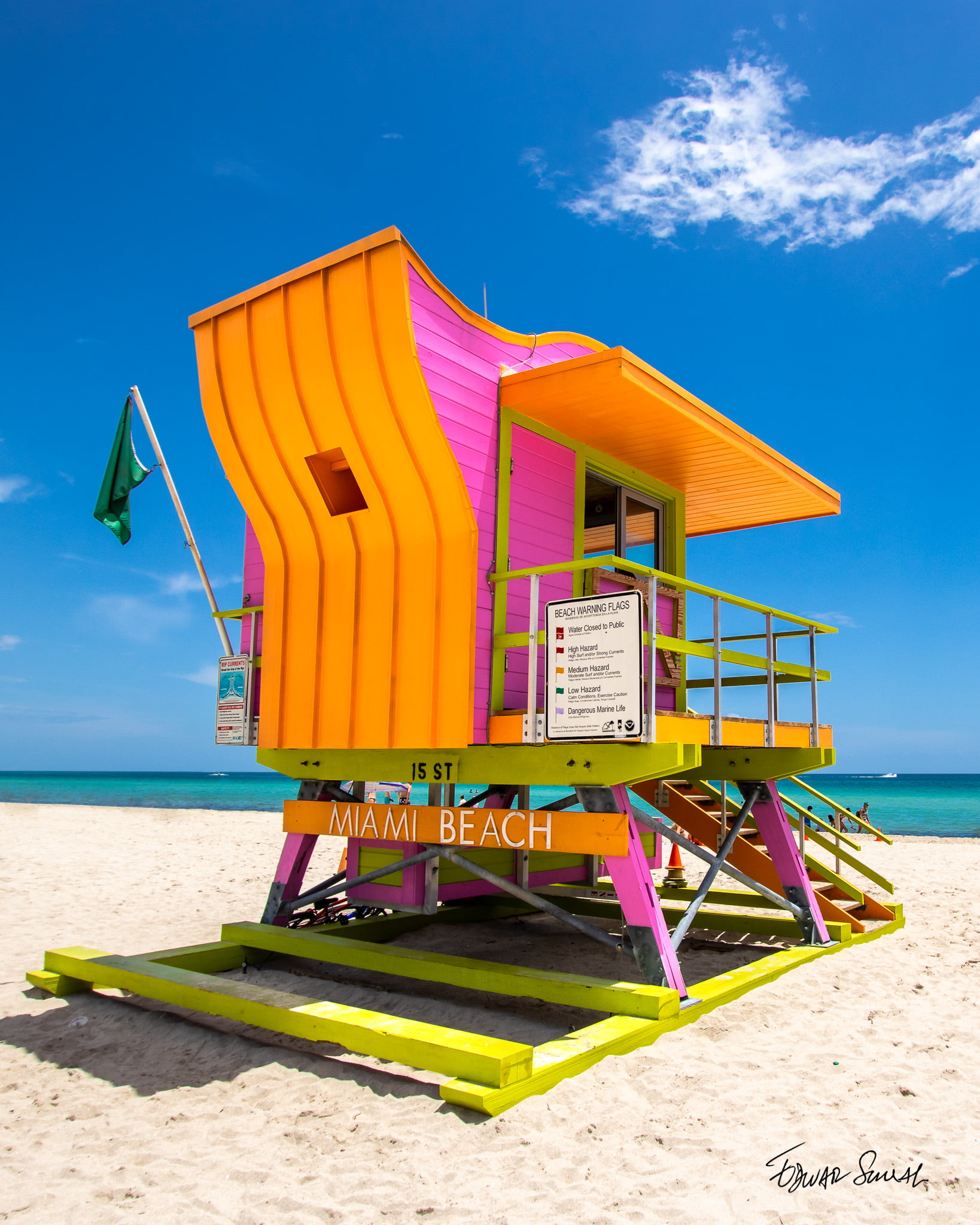 With its pastel colors fuchsia, orange and green and a duck-tale design at the rooftop this Lifeguard Tower is located on 15th St in Miami Beach. Its colors contrast with the warm sand and the wonderful blue sky and the gradient blue ocean.
